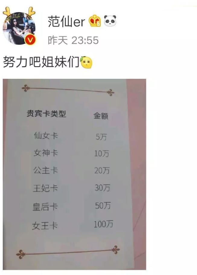 當然,范冰冰美容院開業(yè)后,大家也關注了一個問題,那就是消費到底是什么水平。而后,就有一位微博認證為范冰冰超級粉絲的網友,她發(fā)博曬出了店里的貴賓卡消費標準,并喊話大家要努力。